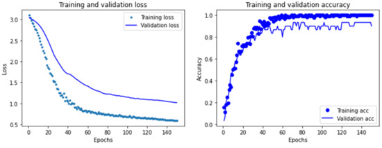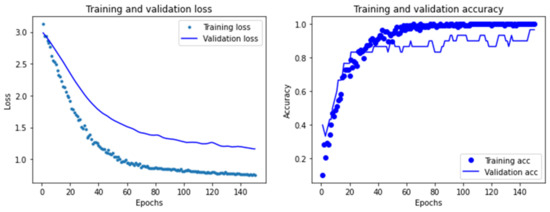 The training epochs were increased to 150 to fully utilize the capabilities of the new optimizer. Figure 17 displays the training results. In this experiment, the network’s classification accuracy increased from 3.33% to 93.33%. The classification accuracy of the model increased from 90.00% to stabilize at 93.33% from the 80th training to the end. The VGG16 network’s accuracy was further enhanced by the Adam optimizer with improved network structure but without hyperparameter tuning. In comparison to the prior experimental data, the convergence value of the loss function in the new network is 1.0171, a decrease of 0.413.