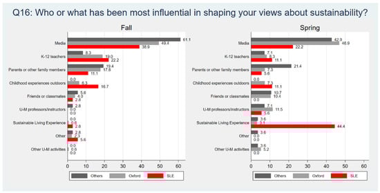 Figure 2 shows results for Q16 in Spring and Fall. When students started at UM in the Fall, media was reported as the most influential on sustainability views across residential groups. In Spring, media continued to be most influential for students living in Oxford or other residence halls, while SLE became the leading influence for SLE students.