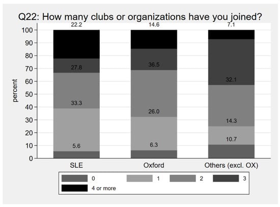 Results for Q22, about participating in UM clubs or organizations, are shown in Figure 5. While a larger percentage of SLE students joined four or more clubs or organizations (22.2%) and a lower percentage joined zero (5.6%), less SLE students overall were involved in two or more organizations (61.1%) than other students at Oxford (67.7%) or in other residence halls (75%).