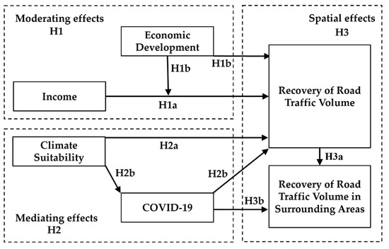 From another point of view, there is a strong link between climatic suitability and COVID-19, whereby climatic factors can determine the transmission characteristics of the pandemic. Several empirical studies based in Australia [47], the United States [48], and other regions have demonstrated the impact of climatic factors in the epidemiological process of COVID-19 and confirmed that COVID-19 is more transmissible in areas at higher latitudes with lower temperatures [49]. Climatic suitability can have both a direct effect on road traffic volume and an indirect influence on the ability of COVID-19 to spread. Therefore, COVID-19 may be an essential part of the mechanism of climate suitability on road traffic volume and may play a mediating effect. Based on this, the following hypotheses are proposed: