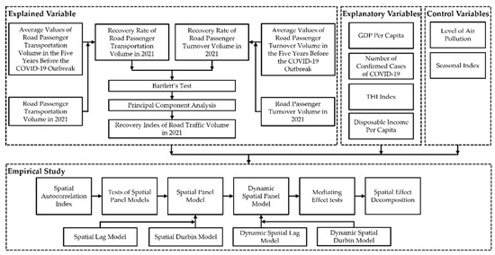 The above studies reflect the broad concern of scholars regarding the pandemic crisis. However, few studies have taken quantitative approaches to the spatial heterogeneity of the recovery of road traffic volume, which is of essential academic and practical significance in promoting the sustainability of related industries. Specifically, the research question in this paper is whether there are factors that can influence the recovery of road traffic volume from the impact of COVID-19. Further, if there are factors that can have an impact, whether this impact is influenced by mediating or moderating effects of other factors or whether it is spatially heterogeneous. To investigate these questions, based on provincial spatial panel data in mainland China, we test the spatial spillover effect of the recovery of road traffic volume from the impact of COVID-19 using a dynamic spatial panel model. Furthermore, we investigate the mechanisms and the robustness of the findings under different spatial weight matrices. Compared with existing studies, the contributions of this paper are as follows: