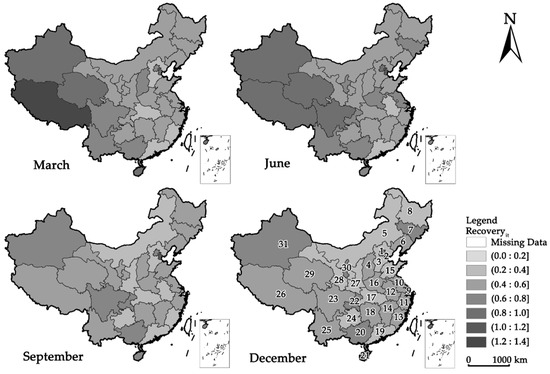 In Equation (10), and are the PCA loadings of and in the ith province. is the explained variable in the spatial panel model. Figure 3 shows the recovery index of road traffic volume for March, June, September, and December of 2021 to demonstrate the four quarters. Among them, we label the province serial numbers consistent with Table 1. It can be visualized that the provinces with higher recovery indices and those with lower indices tend to be adjacent, so we perform further analysis to investigate its spatial heterogeneity.