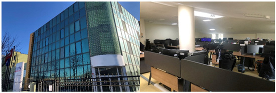 The building was built as 3 floors on an area of approximately 2500 m2. There are 3 fabrication areas on the first floor, laboratories, and seminar halls on the second floor, whereas on the third floor there are 4 officer rooms, an open office, an archive, a warehouse, a dining hall, and a fabrication shop. Mechanical equipment, including the ASHP and other devices and immovable ventilation equipment, is located in the equipment room in the attic. The exterior and interior view of the building is given in Figure 1 and the floor plan of the building is given in Figure 2.