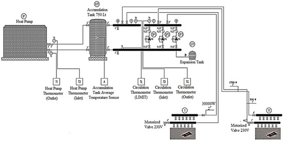 In closed heating circuits, an expansion tank is employed as a piece of safety equipment to prevent the fluid that expands due to high temperature from damaging the system elements due to high steam pressure by eliminating the pressure increases in the system and thus preventing fluid leakage. The piping was fixed being covered with insulation material to prevent heat loss/gain. The piping also featured gauges to monitor the water pressure, at the inlet and outlet of each of the two pumps, and two at the expansion tank. The accumulation tank, which is ideal for high water temperatures, is used to store the water to be transferred to the radiant heating system and heat the water when needed, i.e., when the water coming from the ASHP is not hot enough, by means of a heat exchanger contained within. The accumulation tank also contributes to extra savings by increasing the efficiency of the ASHP in the system.