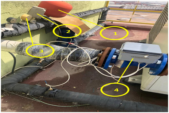 ASHP employed in the system. (1) ASHP expansion tank. (2) Thermocouple and locking system. (3) Analog pressure gauges. (4) UKM-50 ultrasonic flowmeter and calorimeter.