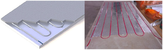 Cross-linked 10.1 mm × 1.1 mm × 8 mm inner diameter polyethylene pipes were used in the panels (PEX-a) as embedded in the 15 mm thick plasterboards insulated with 3 cm polystyrene as seen in Figure 7 [34,35]. The distance between the radiant heating pipes is 5 cm and the total length of pipes (including ceiling and walls) is 13.365 m.