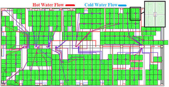 Arrangement of the ceiling heating system, piping system, and connection details on the 3rd floor are given in Figure 8.