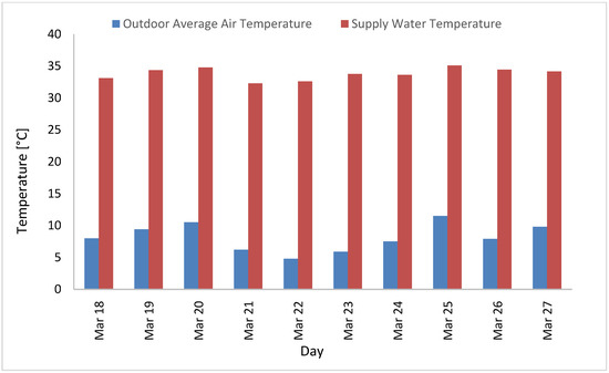 Average outdoor air temperature and HP supply water temperature between 18 March and 31 March (2021).