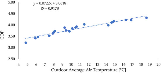 There is a strong correlation between outside air temperature and COP, which means that changes in the source temperature (in this example, outside air temperature) were a major contributor to the observed fluctuation. The empirical relation between the average outdoor air temperature () and the COP value are provided below.
