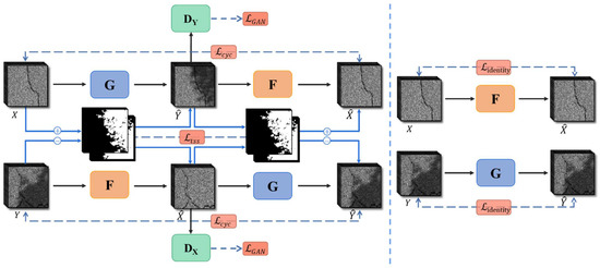 Identity loss is a loss function proposed in CycleGAN. Its function is to ensure the consistency of the color composition of the output image and the input image. To retain the color information of the input pavement image, this loss needs to be added to the task to reduce the color information loss of the generated image. This loss is expressed as follows: