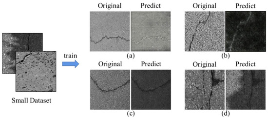 Problems arising from the training of small datasets in CycleGAN: (a) the loss of crack color information, (b) the loss of basic image information, (c) the overfitting caused by the small dataset, and (d) the loss of crack structure information.