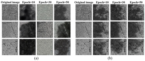 As shown in Figure 3, in the case of a small dataset, the original CycleGAN often suffers from the loss of crack color information (shown in (a)) or the loss of basic image information generation (shown in (b)) at the early stage of training. Moreover, it also suffers from overfitting caused by the small dataset (shown in (c)) and the loss of crack structure information generation (shown in (d)) during the training process.