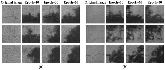 Figure 5 shows the images with shadow texture information generated by the forward mapping of the proposed generative network on the original image, and the shadow texture information in the binary image corresponds to the shape and position information of the shadow of the generated image. We found that the proposed model gradually generates the pavement shadow images closer to the real images, with the number of training epochs reaching 50. It can also be seen from the binary images that, with the progress of training epochs, the position and shape information of shadows were more similar to the distribution of the real shadowed images of the pavement surface. However, as the number of training epochs is 70, the effect of generated shadow images is not better than that of 50. Therefore, we can confirm that the model generation effect reached convergence when the training times reached 50 epochs.