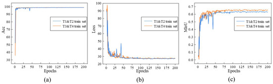 The above datasets were fed into U-Net for training, whereby the T1 and T2 datasets had the same training set and we trained it only once; the same is true for the T3 and T4 datasets. The Acc and Loss evaluation metrics used for training and MIoU changes during the training process are shown in Figure 8. According to Figure 8, it can be seen that the model reached convergence when the number of training times was 200. The final model obtained by training was used to segment the cracks of the test-set images, and the final segmentation effect of the test set is displayed by the main evaluation index.