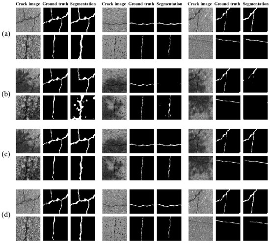 According to Table 4, it can be found that the model trained under the dataset of the original image was able to achieve a better crack segmentation effect for the test set of the pavement crack images without shadows. However, under this model, the three main indicators, namely Recall, F1-score, and MIoU, were all reduced to different degrees when segmenting the dataset with shadow images. It was observed that the training model invested in part of the augmented dataset exhibited better segmentation accuracy for the pavement crack images with shadows than the training model of the original image dataset. Moreover, the model still exhibited good accuracy for the segmentation of the test set of non-shadow images. In summary, we were able to draw the following conclusions: