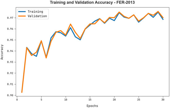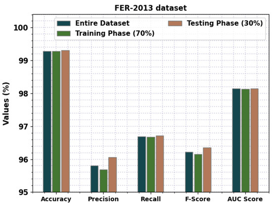 Table 2 and Figure 5 demonstrate a detailed outcome of the TLDFER-ADAS approach on the test FER-2013 dataset. The experimentation values inferred the enhanced emotion classification outcomes of the TLDFER-ADAS model. For instance, in the entire dataset, the TLDFER-ADAS model has reached average of 99.29%, of 95.80%, of 96.69%, of 96.22%, and of 98.14%. Likewise, on 70% of TR dataset, the TLDFER-ADAS algorithm has attained average of 99.29%, of 95.69%, of 96.68%, of 96.15%, and of 98.13%. At last, on 30% of TS dataset, the TLDFER-ADAS system has resulted in average of 99.31%, of 96.06%, of 96.71%, of 96.36%, and of 98.15%.