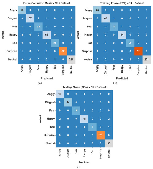 Confusion matrices of TLDFER-ADAS system under CK+ dataset: (a) entire database; (b) 70% of TR database; and (c) 30% of TS database.
