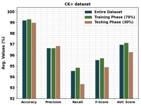 Table 3 and Figure 9 reveal thorough results of the TLDFER-ADAS approach on the test CK+ dataset. These results represented the improved emotion classification outcomes of the TLDFER-ADAS model. For instance, on entire dataset, the TLDFER-ADAS technique has accomplished average of 99.19%, of 96.64%, of 94.54%, of 95.53%, and of 96.95%. Likewise, on 70% of TR dataset, the TLDFER-ADAS system has depicted average of 99.29%, of 96.63%, of 94.82%, of 95.69%, and of 97.12%. Lastly, on 30% of TS dataset, the TLDFER-ADAS approach has exhibited average of 98.95%, of 96.83%, of 93.32%, of 94.87%, and of 96.27%.