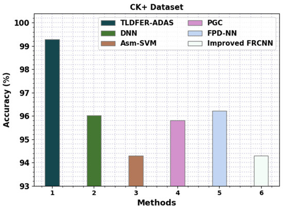 In Figure 13, a detailed comparative study of the TLDFER-ADAS model with existing approaches is given on CK+ dataset. The obtained values indicated that the improved FRCNN model has exhibited minimum outcomes whereas the Asm-VM and PGC models have displayed surely improved performance. At the same time, the DNN and FPD-NN models have confirmed equitable results with of 96.03% and 96.22% respectively. Finally, the TLDFER-ADAS model has outpaced the other models with maximum of 99.29%.
