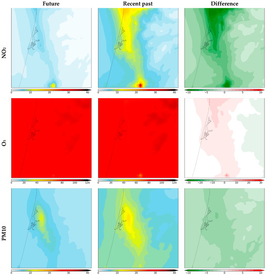 - Sá, E.; Martins, H.; Ferreira, J.; Marta-Almeida, M.; Rocha, A.; Carvalho, A.; Freitas, S.; Borrego, C. Climate Change and Pollutant Emissions Impacts on Air Quality in 2050 over Portugal. Atmos. Environ. 2016, 131, 209–224. [Google Scholar] [CrossRef]