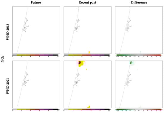 | NO2, annual mean | Premature deaths | 0 (0; 0) | 13 (6; 21) | −13 (−6; −21) | 0 (0; 0) | 241 (83; 560) | −241 (−83; −560) |