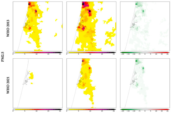 | PM2.5, annual mean | Premature deaths | 3297 (1914; 4836) | 6945 (3864; 9767) | −3648 (−1950; −4931) | 93 (49; 109) | 2234 (1579; 2546) | −2141 (−1530; −2437) |