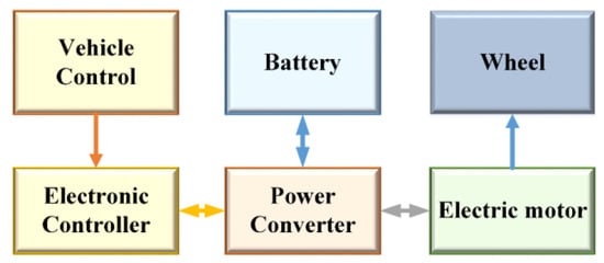 EVs are in many ways similar to vehicles powered by ICEs. The bodies of many EVs in use today are taken from vehicles that previously contained an ICE. However, unlike fossil fuel vehicles, EVs consist of an electric motor, a battery, a vehicle control, a motor driver, an electronic controller and a power electronics converter, as shown in Figure 1.
