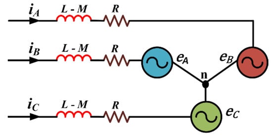 The stator of the BLDC motor consists of concentrated coils spaced 120 degrees apart. The permanent magnets in the rotor are placed one after the other at 180-degree magnetic intervals. Thus, when the motor is rotated, voltage is induced in the rotor windings in the form of a trapezoidal waveform with a phase difference of 120 degrees. A balanced three-phase rectangular current with a conduction period of 120 degrees is required to properly rotate the motor. The electrical equivalent circuit of the BLDC motor is shown in Figure 2. In this model, the rotor and stator winding only excite the spatial sinusoidal voltages and currents. In addition, the magnetic materials are isotropic and there is no saturation.