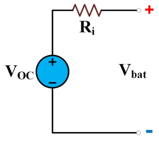 The batteries that contain the energy used to fuel an EV do not have the same range potential as today’s ICE vehicles. This determines the EV’s range, driving characteristics and charging time. A long-range EV requires large amounts of energy. To provide this energy needed in EVs, the batteries are connected to each other in a serial configuration, a parallel configuration, or a combination. In addition, this is why alternative options are often used, such as flywheels and ultra-capacitors. Today, many types of batteries with different chemical properties are used in EVs. The most used batteries are flooded lead–acid, sealed gel lead–acid-, nickel cadmium- (Ni Cad), nickel metal hydride- (NiMH) or lithium-based. Thus, there is more than one model in the literature, depending on the characteristics of the batteries. The battery model to be used in simulations and experiments is important for the accuracy of the studies. Therefore, it is necessary to use suitable models for the estimation of the charge and health status of the battery. However, the non-linear charge and discharge behavior of the batteries increases the complexity of the calculations. In this study, the simplest electrical equivalent circuit of the battery is used, as shown in Figure 3. Since the parallel internal resistance is neglected in this circuit model, the open circuit voltage of the battery remains constant.