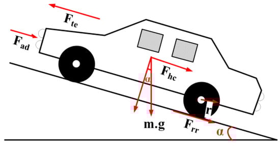 Mathematical knowledge based on the general principles of mechanics is required to describe a vehicles’ behavior. According to Newton’s second law, the change in the momentum of an object is in a set ratio with the propulsion force applied to the object. The change in motion is directly proportional to the net force moving the object, and this force is given in the same direction as the movement. The forces acting on the vehicle, such as rolling friction force, aerodynamic friction force, hill resistance force and acceleration force, are depicted in Figure 4.