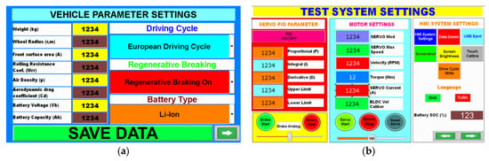 To control the test system and observe the data, the training–control interface is illustrated on the touch panel. Through the parameter input menu shown in Figure 6a, students can set the vehicle’s parameters, the driving cycles and the regenerative braking mode.