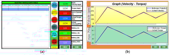 As shown in Figure 7a, it can be seen that after the necessary data are applied, automatic driving is started, and the system data can be displayed on the data view page. Reference torque-speed and instantaneous torque-speed characteristics can be observed via this page during automatic operation, and the obtained data are saved to the Universal Serial Bus (USB) memory at the end of the driving cycle. In addition, a graph of these recorded data can be viewed instantaneously through the HMI page shown in Figure 7b.