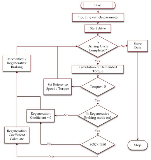 The braking system’s working principle is shown in Figure 8. Firstly, the vehicle and road parameters are entered using the HMI. Then, the driving is started and the required torque is calculated. If the torque demand is negative, it can be checked whether the regenerative mode is active. If the regenerative operation mode is active and the < 90%, the regeneration coefficient is calculated and the brake distribution is performed according to this coefficient. If the regenerative operating mode is passive or < 90%, the regeneration coefficient is considered zero and all braking is done by the mechanical system. In addition, if there is no negative torque demand, the reference speed is set and these processes continue until the driving cycle is finished.
