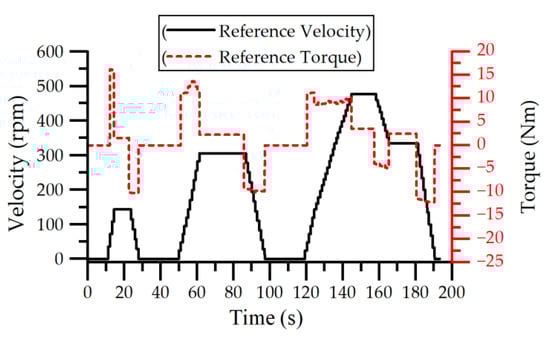 Many driving cycles or profiles have been created by different countries to test vehicles. One of these profiles is the New European Driving Cycle (NEDC), which is widely used in Europe. Here, the NEDC, consisting of the urban driving cycle (ECE-15) and the extra-urban driving cycle (EUDC), is used for the approval of light vehicles. In the ECE15 driving cycle used for the urban test, the average speed is defined as 18.7 km/h, the maximum speed is 50 km/h and the driving distance is 4 km, and it is completed in approximately 193 s. The vehicle’s speed in the ECE-15 is converted to rotational velocity depending on the wheel radius. According to the vehicle’s parameters, shown in Table 2, the forces acting on the EV according to the ECE 15 speed profile are calculated based on the EV dynamic equations, and the required torque values are determined. Figure 9 shows the speed and required torque references of the EV on a straight road for the ECE-15 profile.