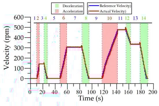 ECE-15 is preferred as a driving profile for the speed reference in all experimental studies. The reference speed data are divided into three regions to determine the dynamic behavior of the vehicle. Firstly, the acceleration regions of the EV are labeled 2, 6 and 10. Secondly, the regions wherein the vehicle moves at a constant speed are defined as parts 3, 7, 11 and 13. Lastly, the vehicle slows down in regions of 4, 8, 12 and 14. As shown in Figure 10, the BLDC machine’s speed is very close to the reference throughout all experiments. The differences due to driving conditions are too small to be considered. Therefore, only one velocity graph from the experiment is shown in Figure 10. Afterward, the students are asked to compare and evaluate the data from the experiment, such as calculated torque, real torque, instantaneous power, and energy parameters.