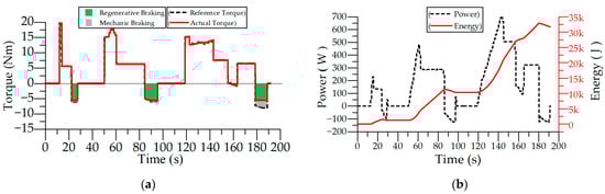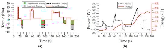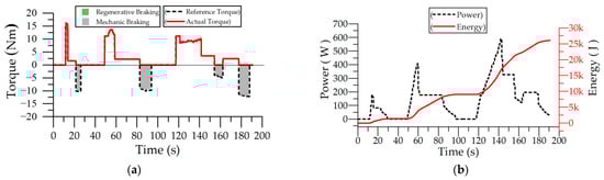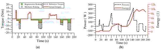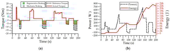 Flat road driving test with regenerative breaking and 50 kg load: (a) torque graph; (b) power and energy graph.