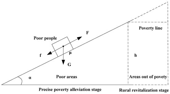 In Figure 1, it is assumed that the inclination angle “α” of the slope indicates the overall difficulty of poverty alleviation in poor areas, the height “h” of the slope indicates the national poverty line standard, the weight “G” of the square indicates the poverty degree of the poor residents, the bottom roughness “μ” of the square indicates the inertia of the poor residents moving out of poverty, and the forces on the poor residents in the process of tourism-precise poverty alleviation are simplified as the tension “F” and resistance “f”. “F” refers to the synergy formed by the joint action of government, tourism enterprises, tourists, NGOs, and other stakeholders to help poor residents and the self-development of poor residents, and “f” refers to the combined force of resistance generated by the level of economic and social development, infrastructure, the difficulty of poverty eradication, the poverty level of poor residents, education level, and inertia of poor residents in poor areas.