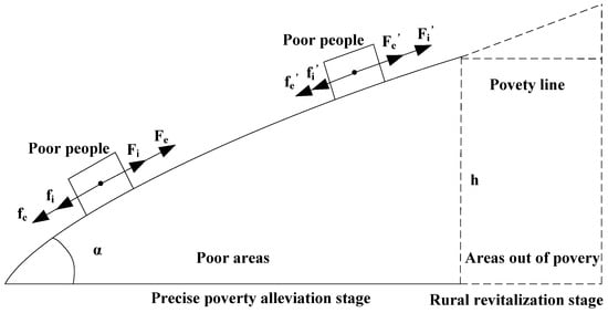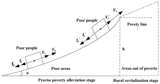 This phenomenon can be explained in Figure 3. As the square moves, the slope becomes less and less steep, and at the same time, the Fi gradually increases (reflected in Figure 3, Fi′ > Fi), fi becomes smaller (reflected in Figure 3, fi′ < fi), fe also gradually becomes smaller (reflected in Figure 3, fe′ < fe), the tension force Fe applied to the square can gradually decrease (reflected in Figure 2, Fe′ < Fe), and the square can keep moving continuously toward the target. Given time, when the endogenous motivation and self-development ability of poor residents are sufficient to ensure their sustainable income, they can still rely on their own ability to move out of poverty and become rich, even if external resources for poverty alleviation are no longer invested. From the strategic planning of China’s precise poverty alleviation, the state’s poverty alleviation resources will be gradually reduced after China achieves full poverty eradication in 2020. Therefore, this model has some realistic significance.