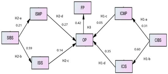 The values of Cronbach’s alpha for almost all the constructs were above 0.80, except for the following four constructs: ISMP2, FP3 OP4, and ICMP3. Their values were below 0.8 but above 0.70, which applies that they are also acceptable. The CFA results regarding Cronbach’s alpha values were not surprising, given that all the constructs had very good unidimensionality. The results indicate the reliability of validity constructs and overall instruments as held by reliability [66]. Please refer to Table 6 for the correlation analysis.
