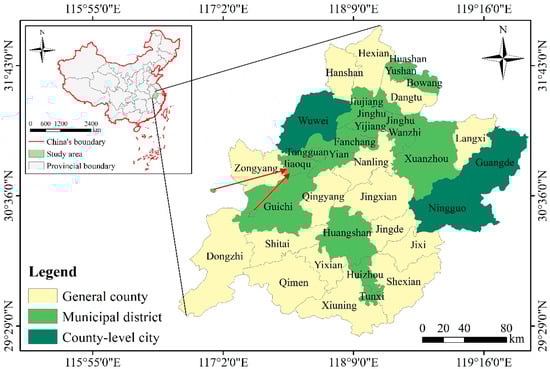 The southern Anhui mountainous area is bounded by the Yangtze River in the north, Zhejiang in the southeast, and Jiangxi in the southwest. Its geographical coordinates are 29°31′ N to 31°00′ N and 116°31′ E to 119°45′ E. A total of 35 county administrative units were found in 6 prefecture-level cities of Huangshan, Wuhu, Ma’anshan, Tongling, Xuancheng, and Chizhou. The administrative units included 16 general counties, 16 municipal districts, and 3 county-level cities (Figure 1).