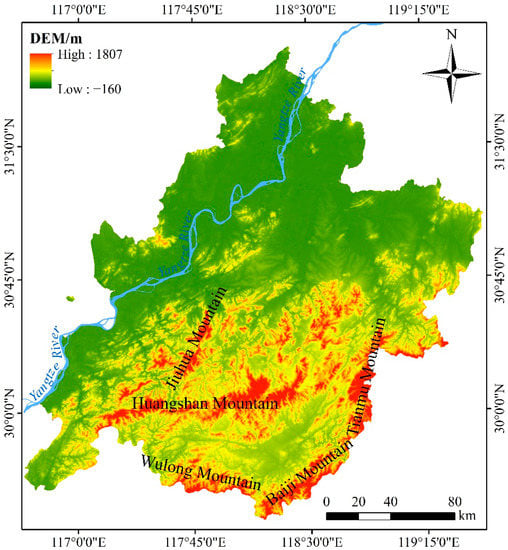 The study area was elevated in the south and low in the north, with an elevation of −160 m to 1807 m, and an average elevation of 188 m (Figure 2). It has a complex and diverse topography, with the Jiuhua Mountain ranges along the NE–SW direction and the Huangshan Mountain ranges along the E–W direction in the middle. The Tianmu Mountain and Baiji Mountain ranges extend in the NE–SW direction along the border between the Anhui and Zhejiang Provinces in the east. The Wulong Mountain ranges extend in the E–W direction along the border between the Anhui and Jiangxi Provinces in the south. The middle and lower reaches of the Yangtze River plain in the north. Multiple basins and valleys are distributed among the mountains.