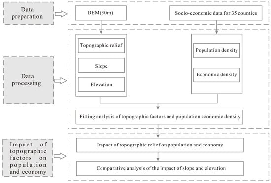 Taking 35 county units in the southern Anhui mountainous area as the research target, this study investigated the impact of topographic relief on population distribution and economic development and compared the effects of slope and elevation. First, based on 30 m resolution DEM data, the ‘preliminary’ and ‘quadratic’ mean change-point analysis was used to calculate the optimal statistical unit, followed by the extraction of the topographic relief. Second, based on socio-economic data, the county population and economic density were calculated. Finally, the impact of topographic relief, slope, and elevation on population distribution and economic development was quantitatively analyzed. The general framework of this study is shown in Figure 3.