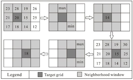 The topographic relief within the given area was extracted by moving window analysis. Analysis of window shapes included rectangle, circle, ring, and wedge. This study used the rectangular window. Figure 4 depicts the basic principle of the moving rectangular window analysis. Based on the DEM grid data, the window value with a fixed analytical size of n×n was determined. By setting the starting window value, moving step, and ending window value, the difference between the maximum and minimum values was calculated in each window as the topographic relief of target grid. Finally, by moving through the window step one by one, the topographic relief of the target grid was obtained under each window.