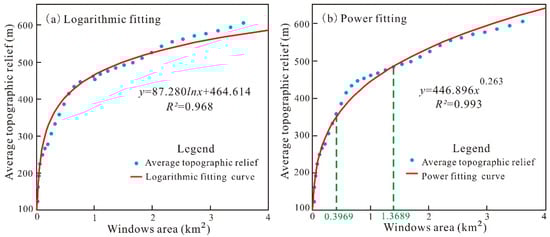 In this study, the starting window value was 2 × 2. In order to avoid the possible absence of inflection point in the change curve due to fewer windows, and data redundancy caused by too many windows, we selected the ending window value as 63 × 63 and set the moving step to 2. Thus, 31 moving windows of different sizes were obtained. Based on the spatial analysis function of ArcGIS software, the average topographic relief within the window was determined and a variation curve was obtained depending on the window size. The curve was fitted using logarithmic or power functions. The results are shown in Table 1 and Figure 5. The larger the R2, the better the fitting effect. Therefore, the logarithmic function fitting was better than the power function. As the window size increased, the average topographic relief gradually increased, reflecting the scale dependence of the topographic relief calculation. Based on the magnitude of the increase, the curve can be roughly divided into 3 stages: steep, steeper, and slow levels.