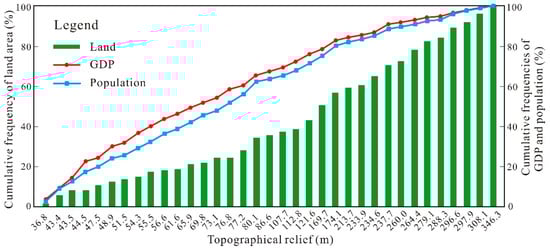 Curve of cumulative frequency of land area, population, and GDP with topographic relief.