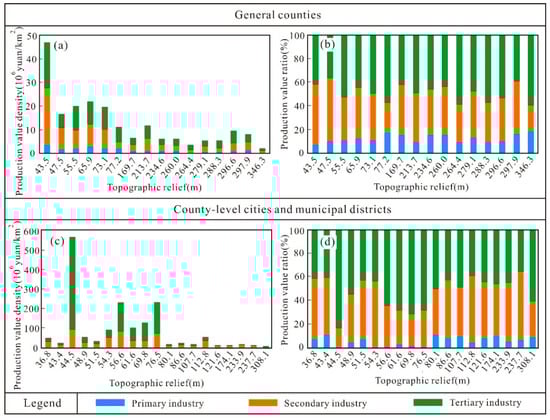 Relationship between production value density and ratio of three industries in general counties, showing (a,b) county-level cities and municipal districts and (c,d) topographic relief.