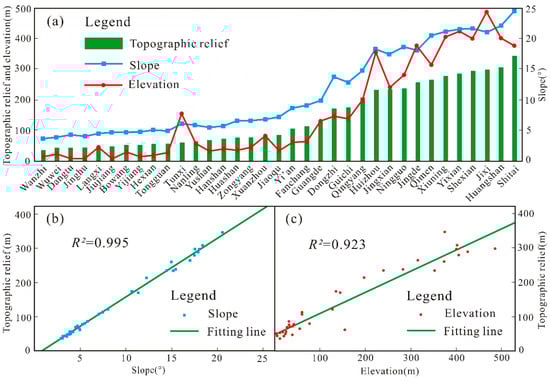 Figure 12b,c presents the results of the correlation analysis. The topographic relief is positively correlated with slope and elevation (p < 0.01), with correlation coefficients of 0.995 and 0.923, respectively. The calculation of topographic relief and slope is similar and is based on the neighborhood analysis. Topographic relief is the calculated difference in elevation within the neighborhood, and slope is the ratio of the calculated difference in elevation compared with the horizontal distance within the neighborhood.