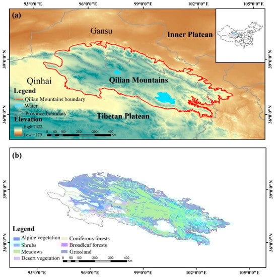 The Qilian Mountains vegetation type data were downloaded from the National Scientific Centre for Glacial Permafrost Desert Data (http://www.ncdc.ac.cn/, accessed on 24 July 2022), which is a vegetation distribution vector data based on an electronic version of the Vegetation Map of the People’s Republic of China (1:1,000,000).