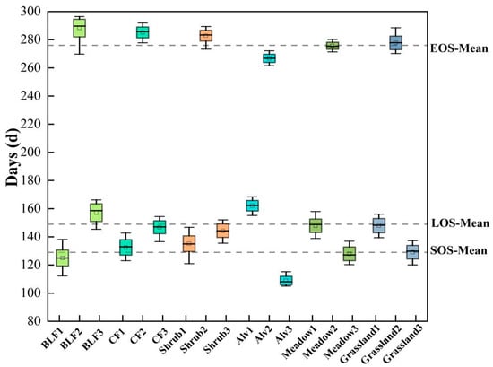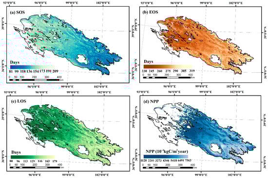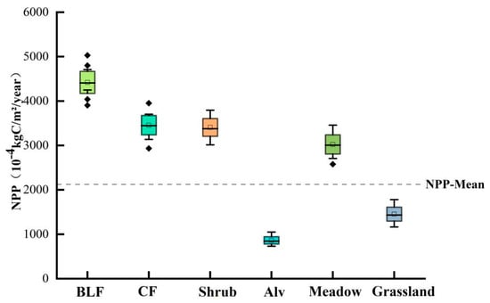 In terms of specific vegetation types (Figure 3), the SOS was broadleaf forests (124 d) < coniferous forests (132 d) < shrub (135 d) < meadow (147 d) < grassland (149 d) < alpine vegetation (162 d), while the regional mean was concentrated approximately 149 d. The EOS was alpine vegetation (266 d) < meadow (275 d) < grassland (277 d) < shrub (282 d) < coniferous forests (285 d) < broadleaf forests (288 d), while the regional mean was concentrated at approximately 275 d. The LOS was alpine vegetation (108 d) < grassland (127 d) < meadow (129 d) < shrub (144 d) < coniferous forests (146 d) < broadleaf forests (157 d), while the regional mean was concentrated at approximately 126 d. NPP (Figure 4) was in the order of alpine vegetation (863 × 10−4 kgC/m2) < grassland (1454 × 10−4 kgC/m2) < meadow (3023 × 10−4 kgC/m2) < shrub (3406 × 10−4 kgC/m2) < coniferous forests (3456 × 10−4 kgC/m2) < broadleaf forests (4420 × 10−4 kgC/m2). The regional mean was concentrated at approximately 2270 × 10−4 kgC/m2.