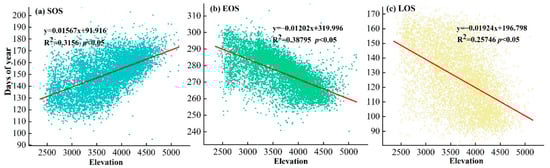 The vegetation phenology in the study area showed an elevation gradient effect (Figure 5). With the increase in elevation, the SOS showed an upwards trend, and the start time of the growing season was delayed with an amplitude of 15.67 d/km. The EOS showed a downward trend, and the end date of the growing season began to advance with a range of 12.02 d/km. Similar to the EOS, the LOS also showed a decreasing trend with increasing elevation, and the length of the growing season was shortened with an amplitude of 19.24 d/km.